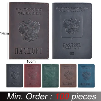 Product Name: 100 أجزاء/وحدة 10x14 سم جلد طبيعي غطاء جواز سفر للاتحاد الروسي مجنون الحصان الجلود ثنائي اللغة جواز سفر