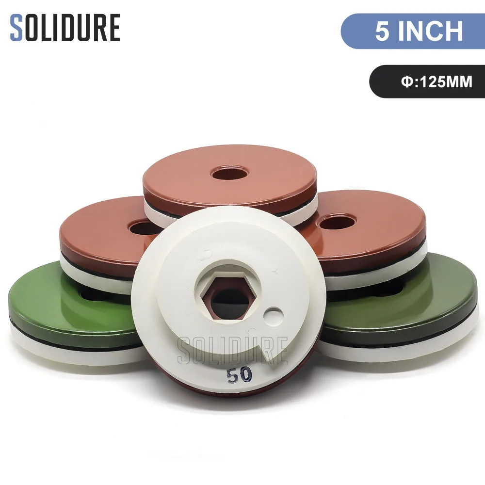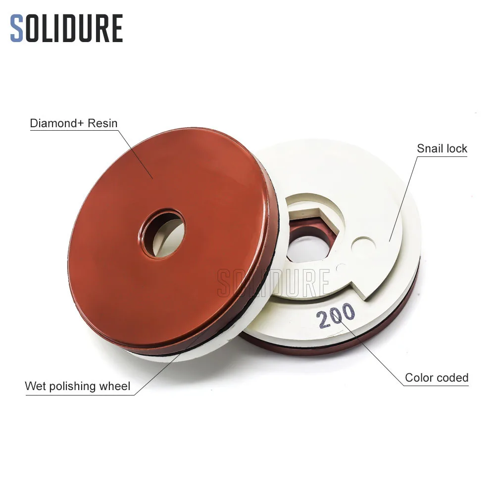 Product Name: 10 مللي متر سمك العمل 5 بوصة 125 مللي متر ألواح التلميع حافة الماس مع الحلزون قفل الداعم لتلميع الرطب الجرانيت ، حافة الرخام